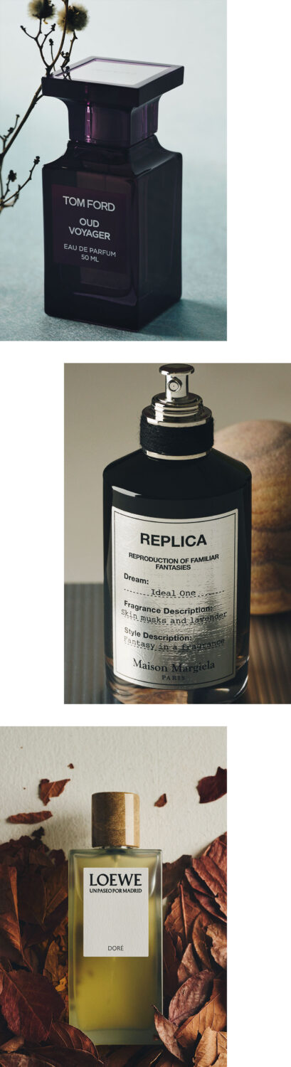 甘さはあるけどフェミニンではなく、凛としていながらもどこかセンシュアル。秋に似合うのはそんな香りたち。ロエベのオードゥ パルファン “ロエベ・ウン・パセオ・ポル・マドリード” ドーレは、華やかだけど使うシーンを選ばない落ち着きのあるフローラル・ウッディ・アンバーの香り。昨年のリニューアルでさらに魅力と人気が高まったメゾン マルジェラのコレクション、レプリカ オードパルファン。その中でおすすめしたいのが、“運命の肌の香り”を具現化したレプリカ オードパルファン アイディアル ワン。香ばしさとクリーミーな温もりと甘さが溶け合うセンシュアルな香調が特徴的。トム フォードの新作、ウード・ヴォヤージュ オード パルファム スプレィは、複雑で豊かな芳香を持つウードにゼラニウムやピオニーといった花々の香りを組み合わせた香り。バイオレットカラーのアイコニックなボトルも思わず手に取りたくなる理由のひとつ。今回紹介する香りはどれも、多面的な魅力を持ち、そしてジェンダレス。秋という季節だけでなく、時代の気分にもぴったり。