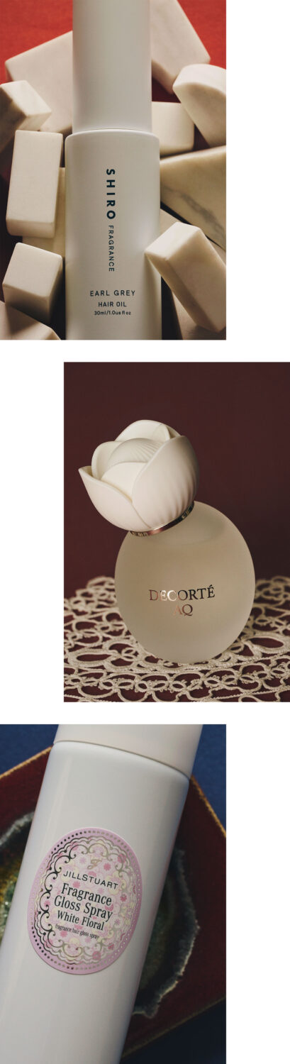 心の幸福度と美肌の関係にまつわる研究から生まれた香りを纏えるコスメデコルテの“スキンケア香水”シリーズのニューフェイス、AQ パフュームド ヘアミスト。AQのスキンケアシリーズのキー成分でもあるみずみずしい金香木の香りが主役の清らかで優美な香り。ピュアな香りがお好みなら、ジルスチュアートのホワイトフローラル フレグランスグロススプレーを。フレッシュなフルーティから始まり、愛らしいフローラルを経て、ウッディムスクの温もりに癒される。純白のブーケを思わせるピュアでロマンティックな香りが特徴です。ヘアオイルとフレグランスのハイブリッド。それを叶えるのがSHIROのヘアオイル。中でもアールグレイは秋のムードにぴったり。温かみの中に、みずみずしさもある。主張しすぎない香りはデイリー使いにもってこい。香水よりも柔らかな香り立ちで、場所を選ばず楽しめるのがヘアフレグランスの魅力。ヘアケア成分を配合したものを選べば、髪のツヤめきまでサポートできます。