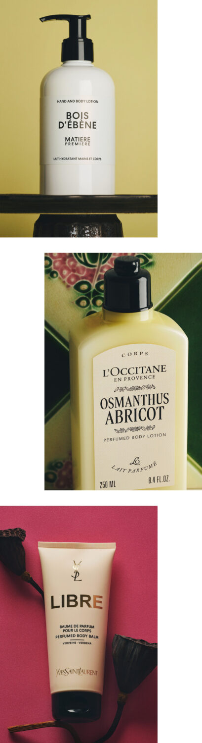 乾燥が気になり始めるこれからの季節。保湿成分でボディを乾燥から守りながら香りを纏えるアイテムが頼りになります。イヴ・サンローランのリブレ ボディバームは、人気フレグランス “リブレ”の香りのボディケアアイテム。シアバター*1やアーモンドオイル2を配合し、保湿力もグッド!香りとボディケアの両立が得意なロクシタンからはブランドの中でも人気の高いオスマンサス(金木犀)の香りを主役に据えた新ラインがお目見え。オスマンサスアブリコ パフュームド ボディミルクは、プロバンスに咲く植物や花々に着想を得て生まれたみずみずしさと甘さ、そして深みを持つ香り。メゾンのルーツと新しさが共存するパッケージにも注目を。大人の女性に相応しい香り立ち、マティエール プルミエールのボワ デベーヌ ハンド&ボディ ローション(ラトリエ デ パルファムにて販売)もおすすめ。アンバリーウッドが香りに奥行きをもたらし、ミステリアスでクールなムードに。重めの香りビギナーでも、ボディローションの軽やかな香り立ちならば臆せずトライできるはず。