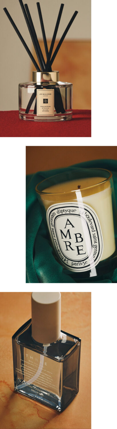 季節が変わったら、香りも秋仕様に!デフューザーやキャンドル、ルームミストを使えば、空間をお気に入りの香りで満たすことができます。ディプティックのロングセラー、クラシックキャンドルで秋にぴったりなのが、スパイスをメインに据えたアンブル。緑に覆われた深い森を思わせる芳香が、自宅でリラックスして過ごす時間に寄り添ってくれます。ベッドルームを穏やかに演出するなら、天然由来成分100%の精油を余すことなく使ったTHREEのフレグランスミスト、ECOCERT FRAGRANCE レリーヴドを。フローラルシトラスグリーンの芳香は、就寝前のリラックスタイムにもフィット。秋のエッセンスをぎゅっと閉じ込めたような、ジョー マローン ロンドンのイングリッシュ ペアー & フリージア セント サラウンド™ ディフューザーにも注目を。秋のフルーツ、洋梨にフリージアやパチョリ、ウッドなどの香りをトッピング。フルーツの爽やかさやみずみずしさだけでなく、上品な落ち着きも兼ね備えた万人に愛されそうな香りは、ギフトとしても人気です。好みの香りで空間を秋仕様に整えて、日々の生活をより充実したものに。