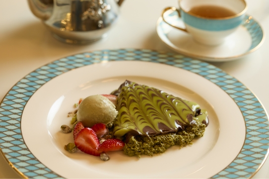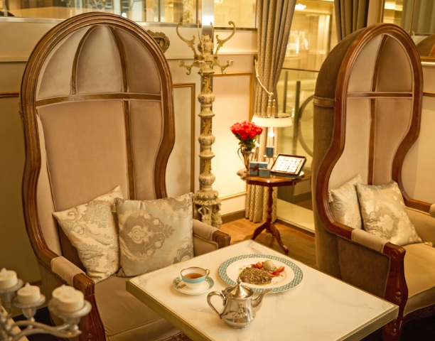 NY発チョコレートブランド「マリベル」のラウンジで、優雅な非日常の世界へ。ドーム状の天蓋が付いたポーターズチェアにひとたび腰をおろせば、繭のようにすっぽりと包み込まれる座り心地で周囲の喧騒を忘れさせてくれます。特別な時間にふさわしいのは、話題のドバイチョコレートをマリベルらしく仕立てた逸品。厳選チョコレートを使用したクレープ生地でイタリア産高級ピスタチオ味のカダイフをたっぷりと包み込んでいます。甘く芳しいフレーバーティーとぜひご一緒に。