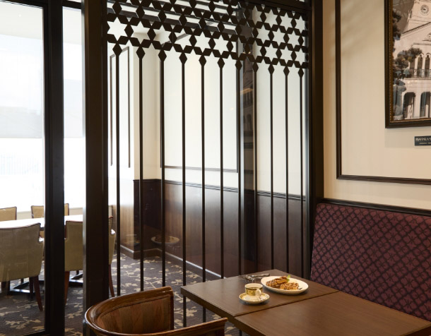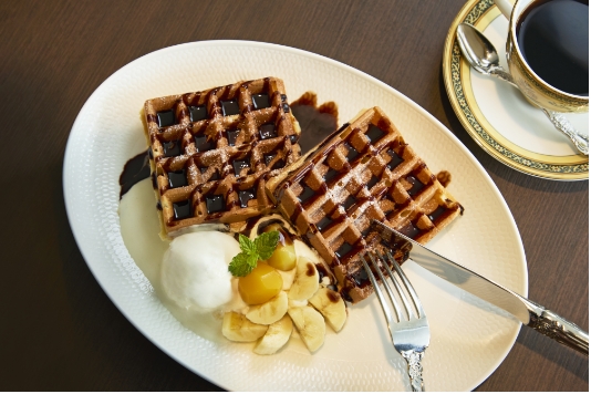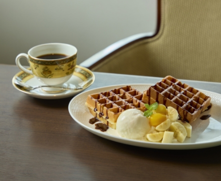1933年、華やかなりし大大阪時代を反映した美観を纏い竣工した大丸心斎橋店旧本館。その設計者であるウィリアム・メレル・ヴォーリズによる「ヴォーリズ建築」をイメージした喫茶サロンがこちら。アラベスク調の模様など特徴的な意匠をあしらった店内で、ゆったり上質な時が過ごせます。窓際の個室(有料)は、周囲に気兼ねなくおしゃべりを楽しみたい時におすすめ。看板メニューは、焼きたてのサクふわワッフル。セットのドリンクは紅茶なども選べて、コーヒーは1杯おかわりできるのもうれしいポイント。