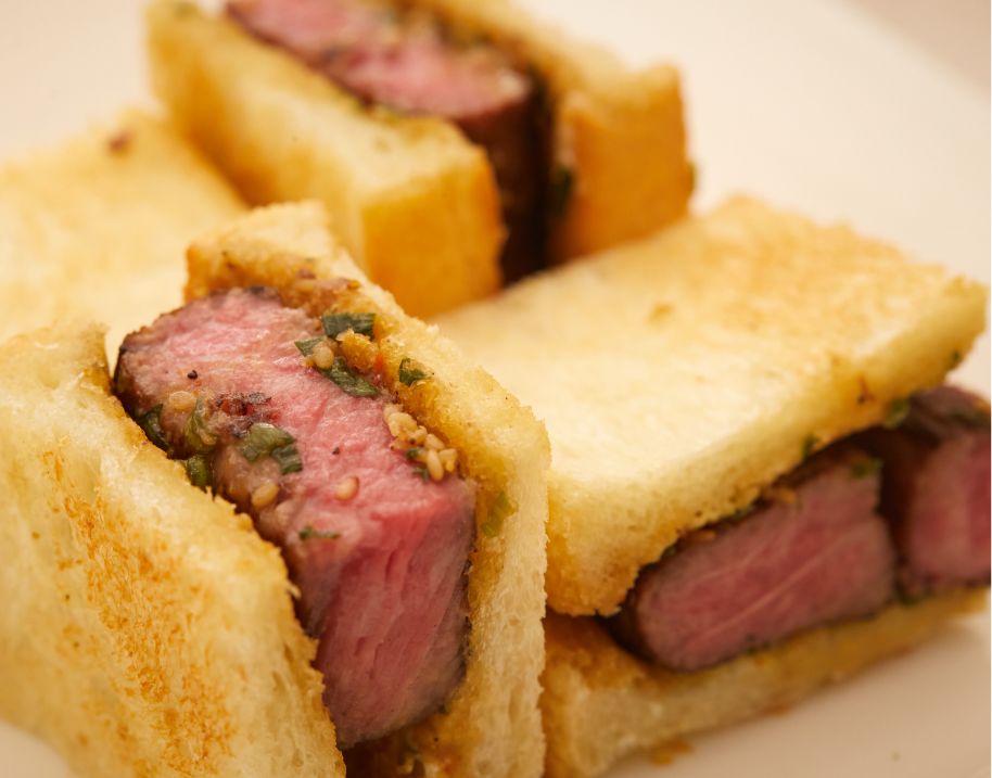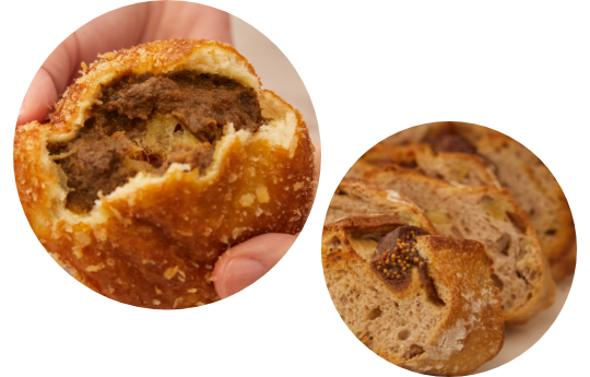 天然酵母のみを使用し、熟練の職人が手をかけ時間をかけてじっくり発酵させることで、素材本来の風味が際立つ〈聖庵〉のパン。高級ステーキ店とのコラボサンドは、低温熟成ビーフのうま味と香ばしいトーストが引き立て合う名物メニューです。豚の角煮がゴロっと入ったカレーパンは、もっちりとした生地の甘みが特徴で、某グランプリ金賞を2年連続受賞。くるみとイチジクのパンのしっとり重厚な食べ応えもたまりません。
