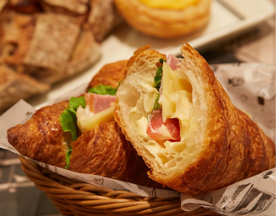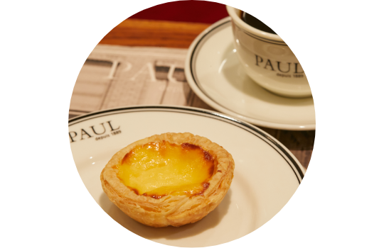 フランス発ブーランジェリーの伝統を守り続ける〈ポール〉。看板メニューのクロワッサンは、発酵バターを使用した生地をフランスから直輸入した本場の味わい。エメンタルチーズやハムを挟んだミックスサンドも人気です。パステル・デ・ナタは、サクサクのパイ生地に濃厚なカスタードが入った、話題のポルトガル式エッグタルト。はちみつを使った生地にイチジクとくるみを練りこんで焼き上げたカンパーニュなどハード系パンも豊富にそろいます。