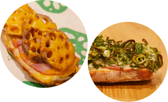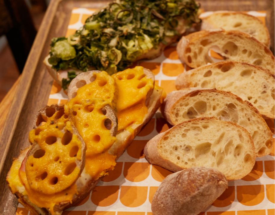 国産小麦にこだわる〈パンデュース〉の魅力がまっすぐ伝わるのがバゲット。北海道産小麦を使用し低温で長時間発酵、濃いうま味ともちもち食感が特徴です。バゲットに旬の野菜をたっぷり乗せたタルティーヌ(フランス式のオープンサンドイッチ)は、まさに真骨頂。厚切りのシャクシャクれんこん、風味の強さがクセになる九条ネギ&ゴルゴンゾーラは本店の人気メニューで、満を持して心斎橋店に初登場!