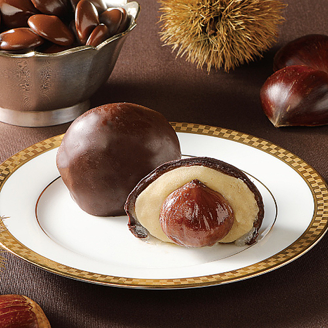 渋皮栗の甘露煮を、自家製の栗きんとんあんとお餅で包んだモンブラン大福に、なめらかなカカオが香るスイートチョコをたっぷりとコーティングしました。