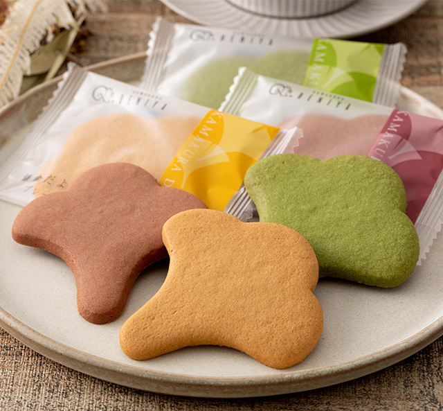 鎌倉の風情を、3種類の香り豊かなサブレで表現しました。バターとはちみつベースの「プレーン」、鎌倉彫のカラーを十勝産あずきで表現した「あずき」、青葉若葉の銀杏を西尾産の抹茶で表現した「抹茶」。軽やかな食感と、ほんのり香る甘さをお楽しみください。