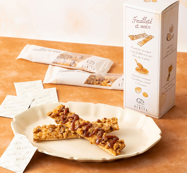 ふんだんのクルミをのせたサクサクのパイに、「クルミッ子」のキャラメルを再現したクルミッ子キャラメルソースをお好みでかけてお召し上がりください。