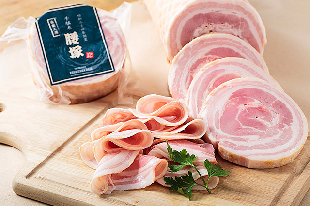 豚バラ肉を贅沢に丸めて作ったベリーハムは、しっとりとした食感とやわらかな脂の甘みが特徴です。