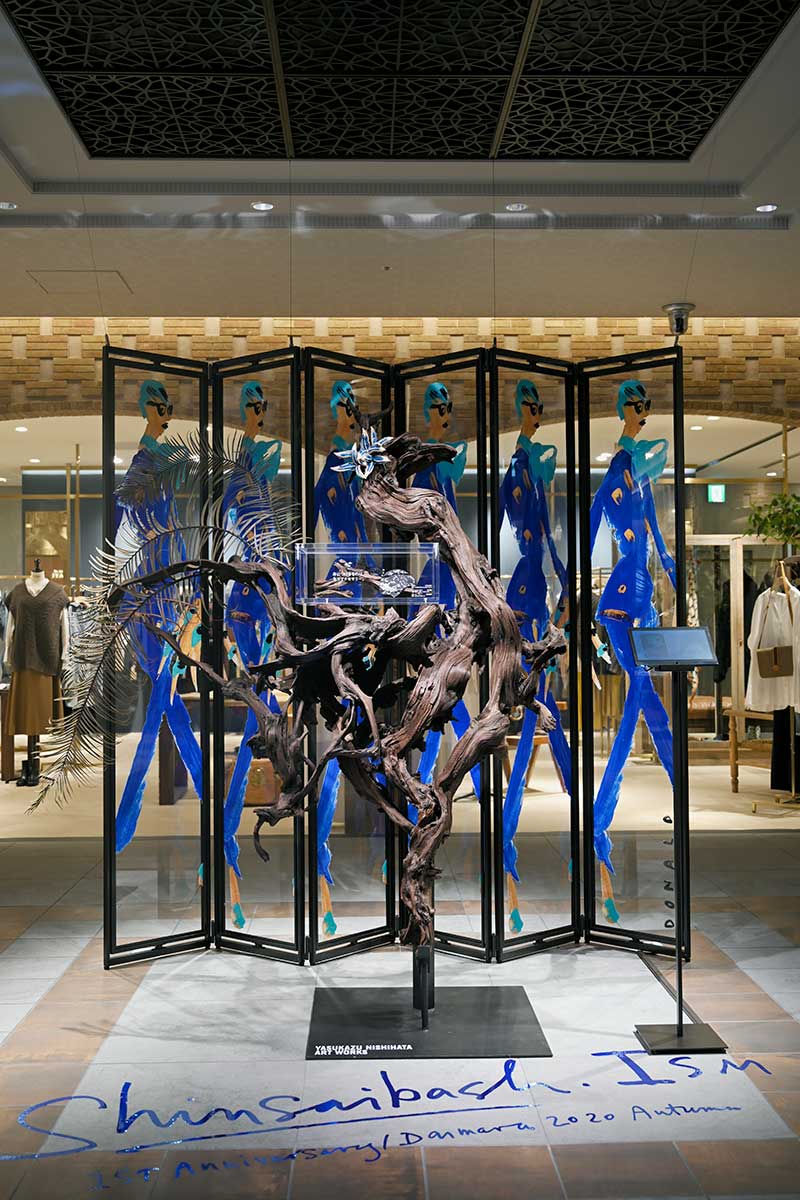 ヴォーリズ建築の天井と響き合うようにマッチする古代の原木が、独特の空間を生み出しています。ニリに加えて、針葉樹の真柏(シンパク)、そしてまるで孔雀の体の色を思わせるような青いオオギバショウの実があしらわれています。この鮮やかなブルーはなんと天然の色!自然の持つ神秘性と力を感じさせます。ここに大丸心斎橋店ならではのマネキンを加えて、壮大な大作となっています。