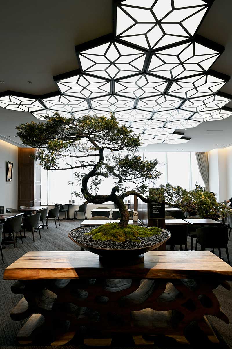 最後に、会員制の「D’sラウンジ」に展示された西畠さんの作品も特別に紹介します。自然光が差し込む広い空間にふさわしく、あえて台からはみ出るサイズの斑入りビャクシンを配しました。見事な台も高級材のタマリンドを使った西畠さん作品です。