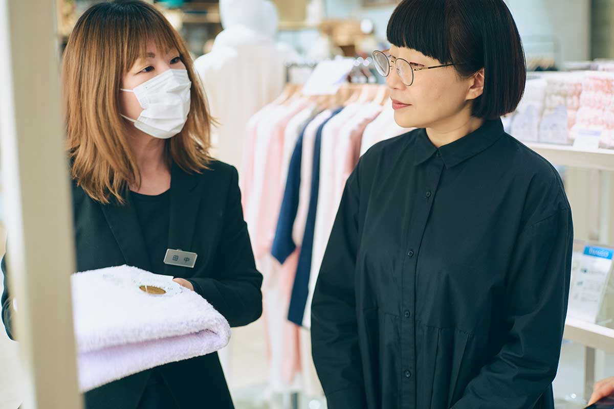 「毛羽落ちを防ぐために柔軟剤を使わず、自然乾燥の場合は干す前に10〜20回ほど振っていただくと、ふんわり感が持続されます。もちろん消耗品ですので使い込むほど硬くなってしまうのですが、お手入れ次第でこの触感が長持ちします」とスタッフの田中仁美さん。
