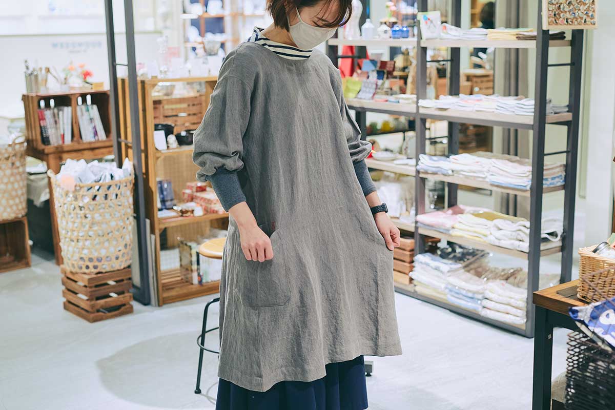 「おしゃれですね。これなら割烹着として着ていても外に出れると思う!」と堀部さん。リネン素材の落ち着いた佇まいに、袖口はフィット感のある長いリブ付き。