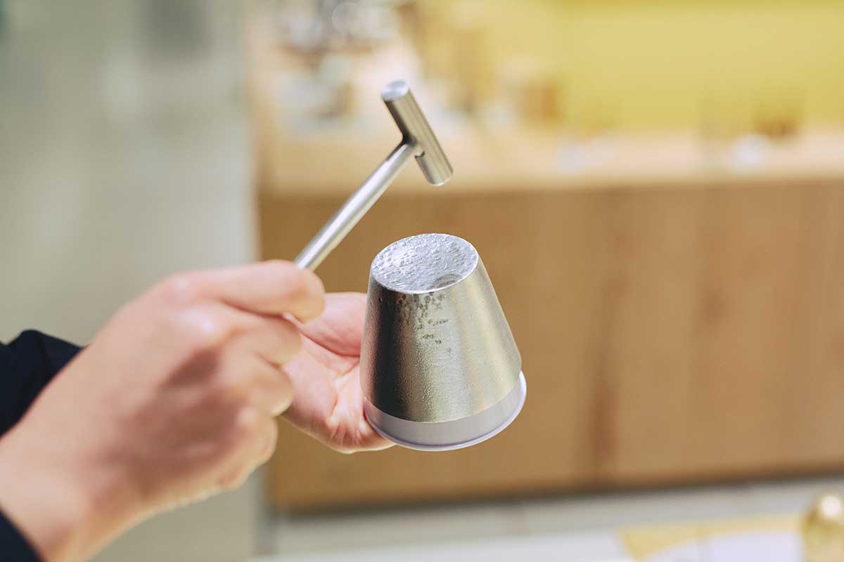 タンブラーに続く新作として登場した鎚目キット第2弾は、ひとまわり小さなぐい呑。店頭に並ぶ容量435ccの「ビアカップ - L」を指して、「できることならこれくらいの大きさのものをカチンカチンしたい(笑)」と堀部さん。呑兵衛な一面を垣間見せつつ、「自ら仕上げができたら、愛着が湧きそうですよね。錫のカップなら割れないし錆びないし、一生もの」と、改めて「能作」のアイテムに魅了されたようです。