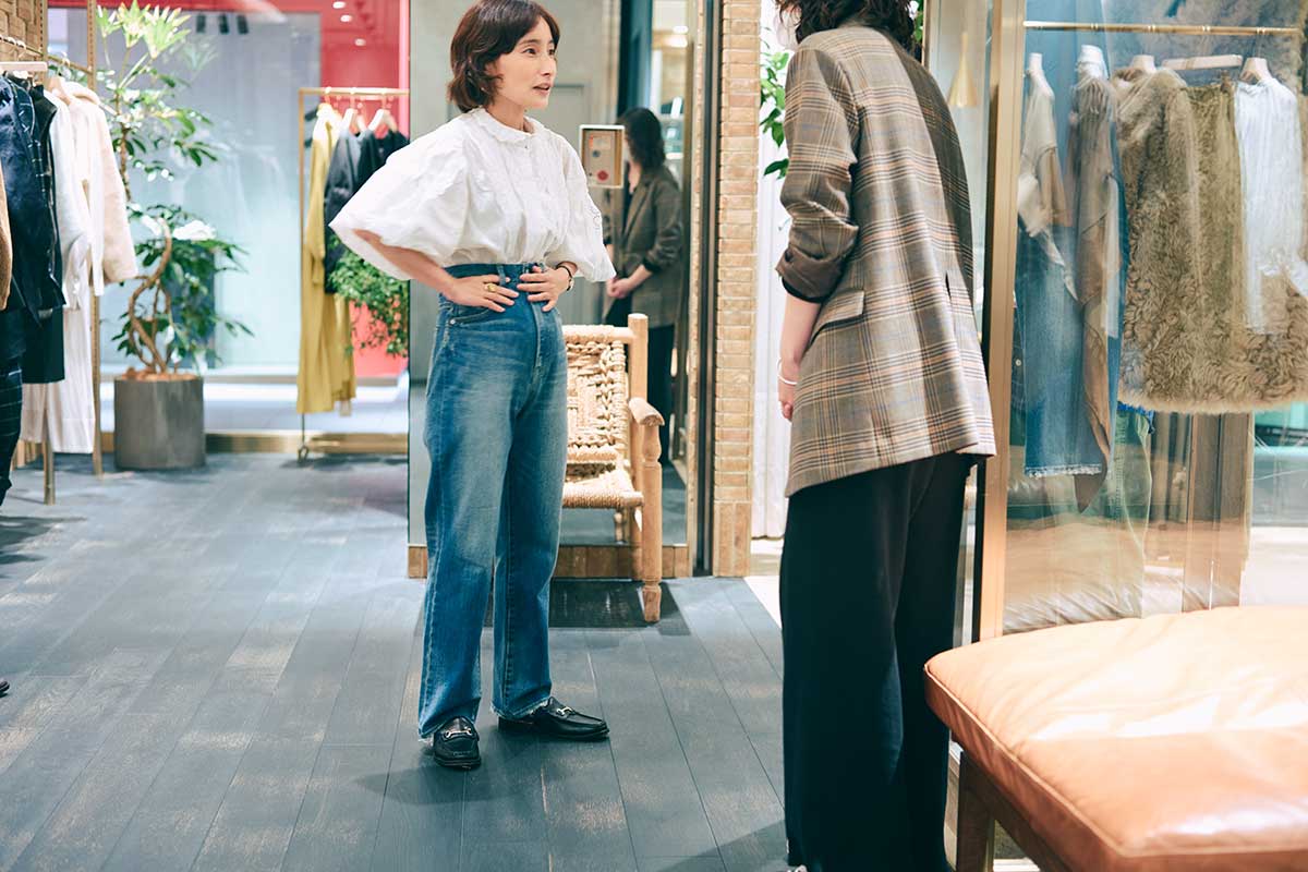 続いて気になったデニムは「カレンソロジー」のオリジナル。ハイウエストな股上とワイドストレートなシルエットが特徴のデニムで、履き心地抜群の360度ストレッチが採用されています。ハイウエストなパンツが大好きだというよしいさんは、「履いてみたいです」と早速フィッティングルームへ。