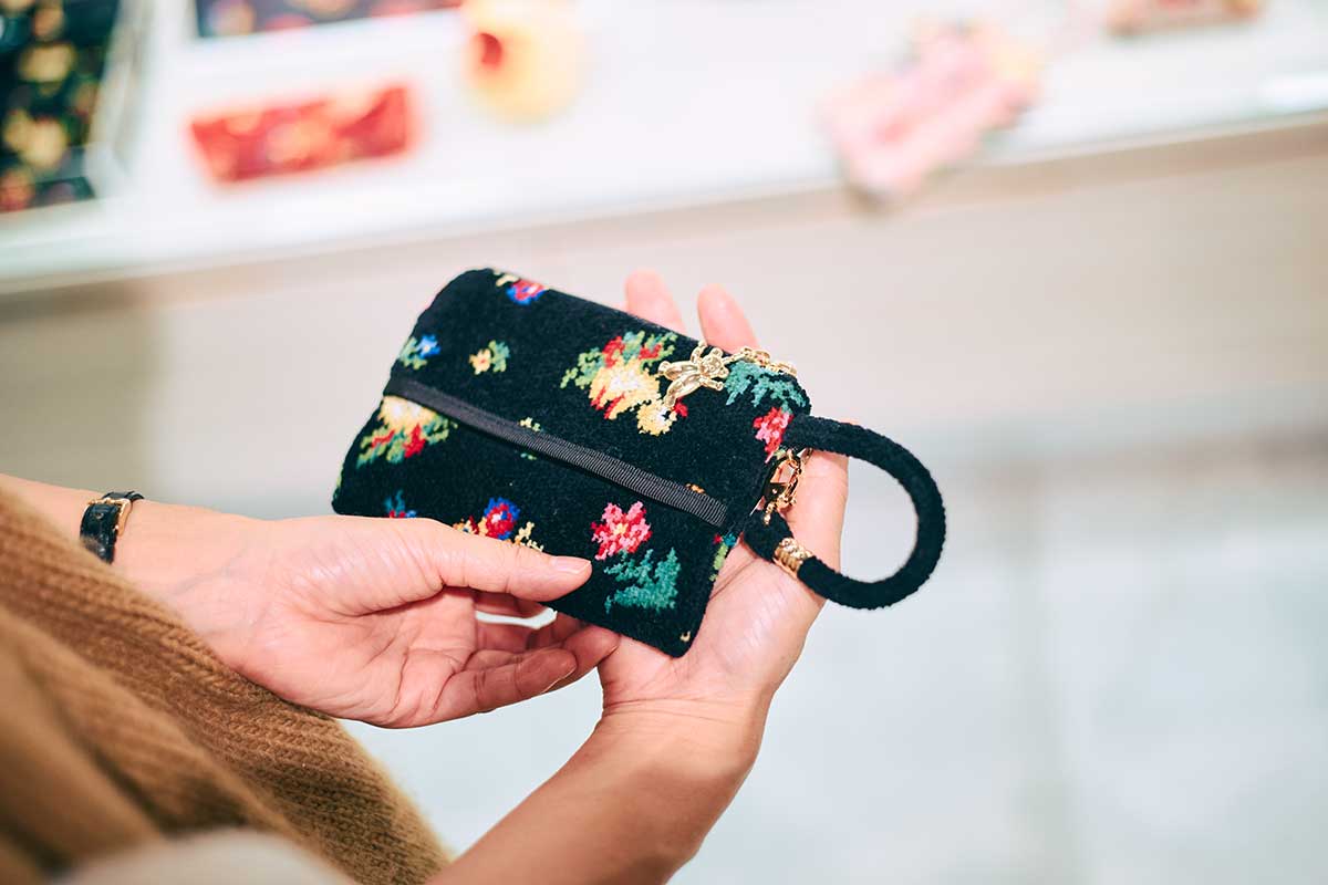「あと、『Heriter(エリテ)』は置いていますか?」とたずねるよしいさんに、スタッフの松本京子さんが差し出してくれたのがキャメルのアランニット。聞けば、よしいさんはブランド「エリテ」とのコラボアイテムを試作中で、2021年12月には自身がコレクションするアンティークからインスピレーションを得て、手仕事たっぷりに仕立てたブラウスを発売する予定だそう。縁のあるブランドのニットを羽織り、さらに「可愛い!」と気になった黒のヴィンテージバッグも合わせると、コーディネートは完璧!