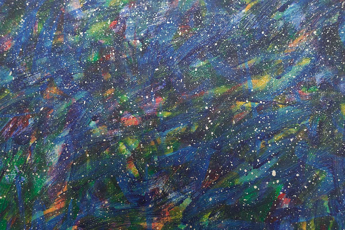 「量子力学を学んでいくと、無から有…よく仏教で言われる色即是空の世界にもつながって。絵自体も木枠とキャンバスと絵具でできた物質ですけど、それがなぜ人の心を打つのか。人も絵も宇宙も全部つながっているとすれば、みんないっしょの世界におる、それをなんとかわかりやすく絵の世界で具現化できへんかなと。今は単純明快に宇宙っぽいものを描いているような感覚でしか捉えられないかもしれませんけど、今説明を尽くせてないことが、もっと血と肉となれば、また違う絵に変化していくんじゃないかと思っています」