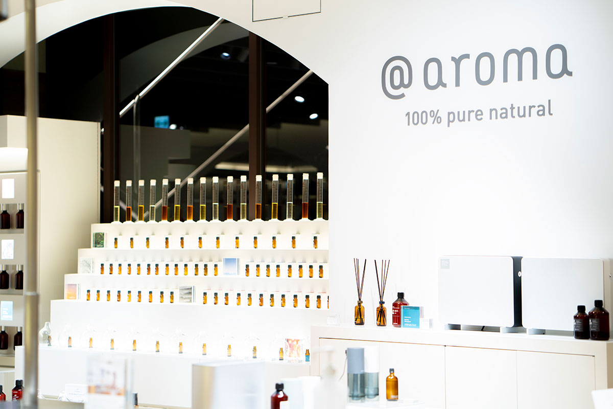 続いて訪れたのは、100%天然素材にこだわる香りの専門ブランド「@aroma(アットアロマ)」。こちらは、大丸心斎橋店本館の香りの演出もしていて、建物の内外装やフィロソフィーに合ったオリジナルオイル“Shinsaibashi”をプロデュース。1階のエントランスやラウンジでも使われています。