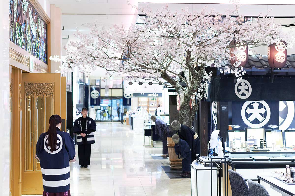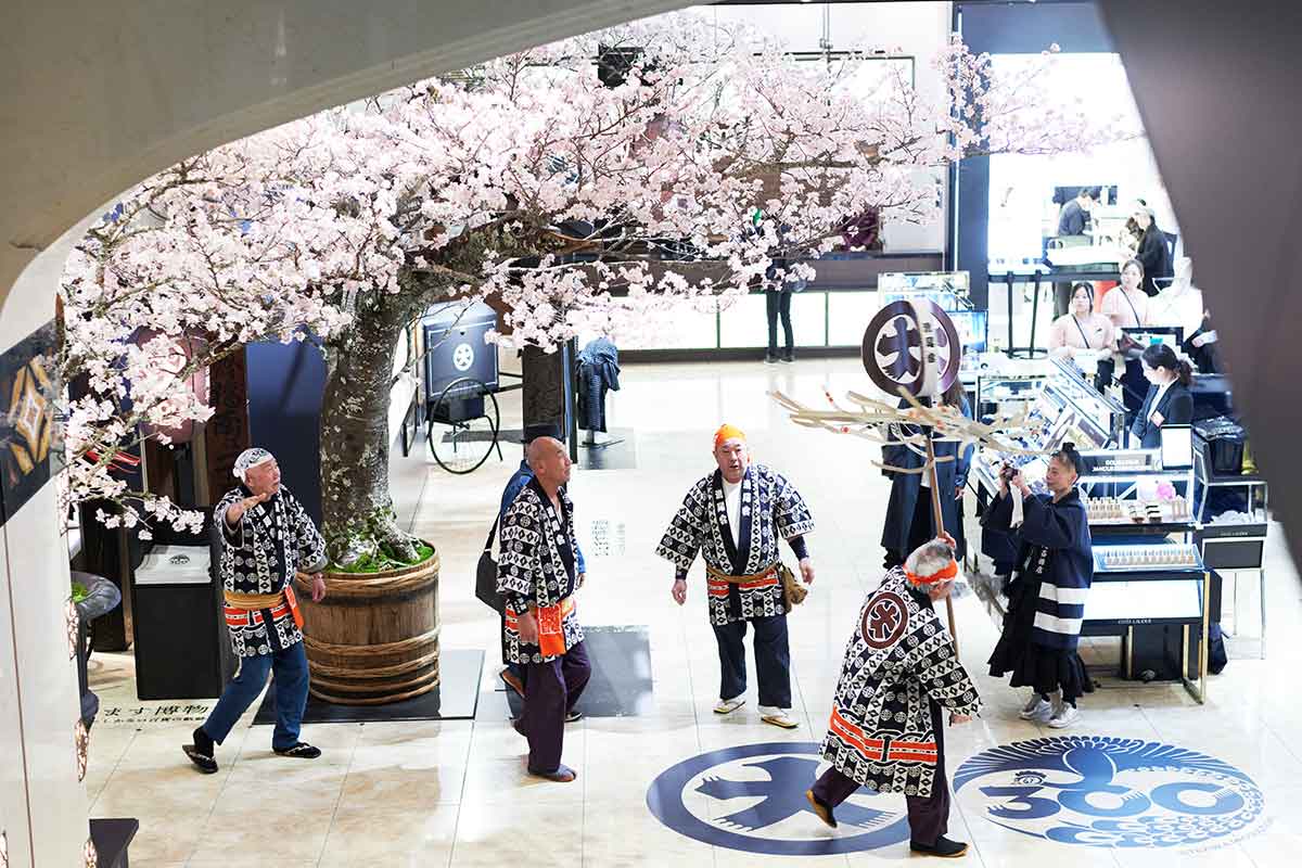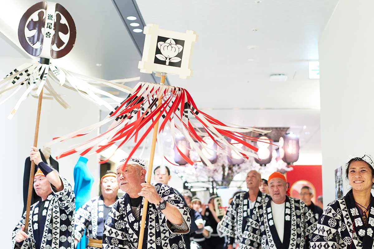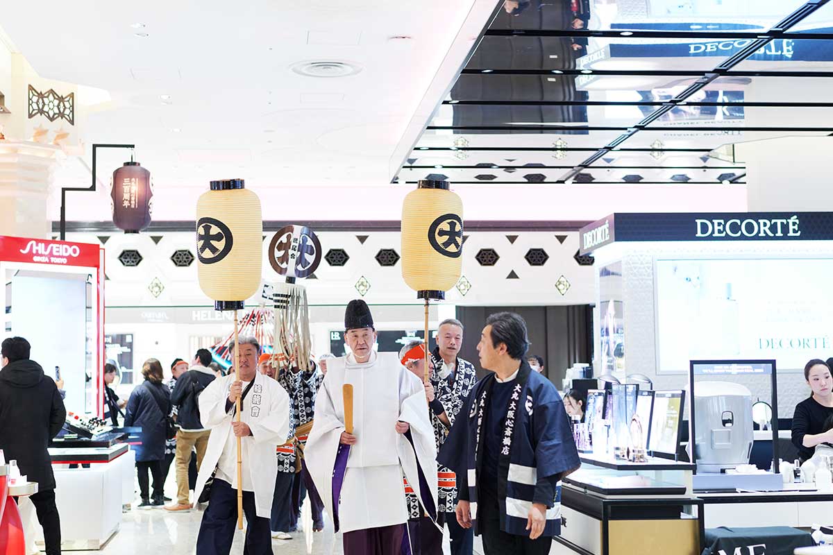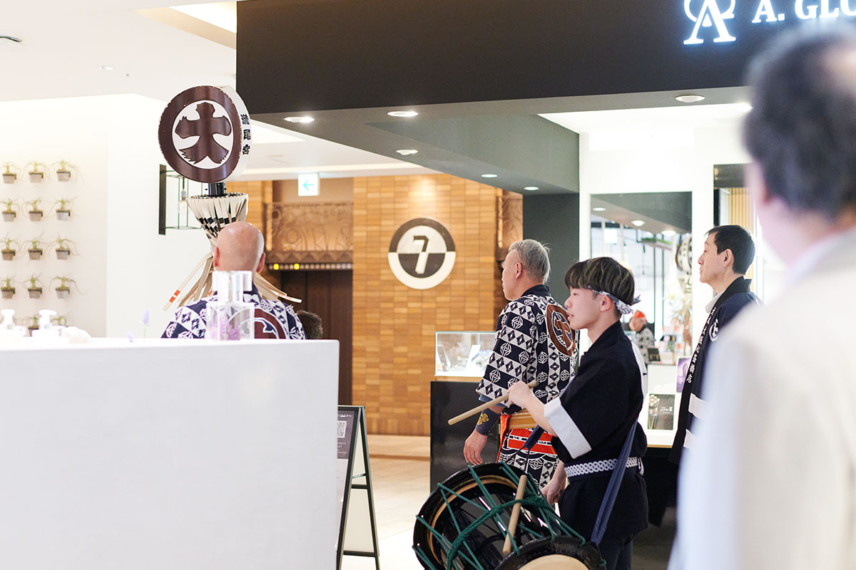 3階の展示を見ているときに、何やら階下からお囃子の音が聞こえてきました。これは、取材日の3月8日(日)に限り行われた行事「纏いと太鼓の奉納」。大丸創業者である下村彦右衛門正啓が崇敬していた京都東山の瀧尾神社によるもので、大丸心斎橋店本館の1階から3階、5階へと、宮司さんを先頭に、印袢纏を着た約20人が太鼓を回したり笛を吹きながら練り歩きます。館内のお客様がスマホを向けたりスタッフも拍手をしたりで大盛り上がりです。
