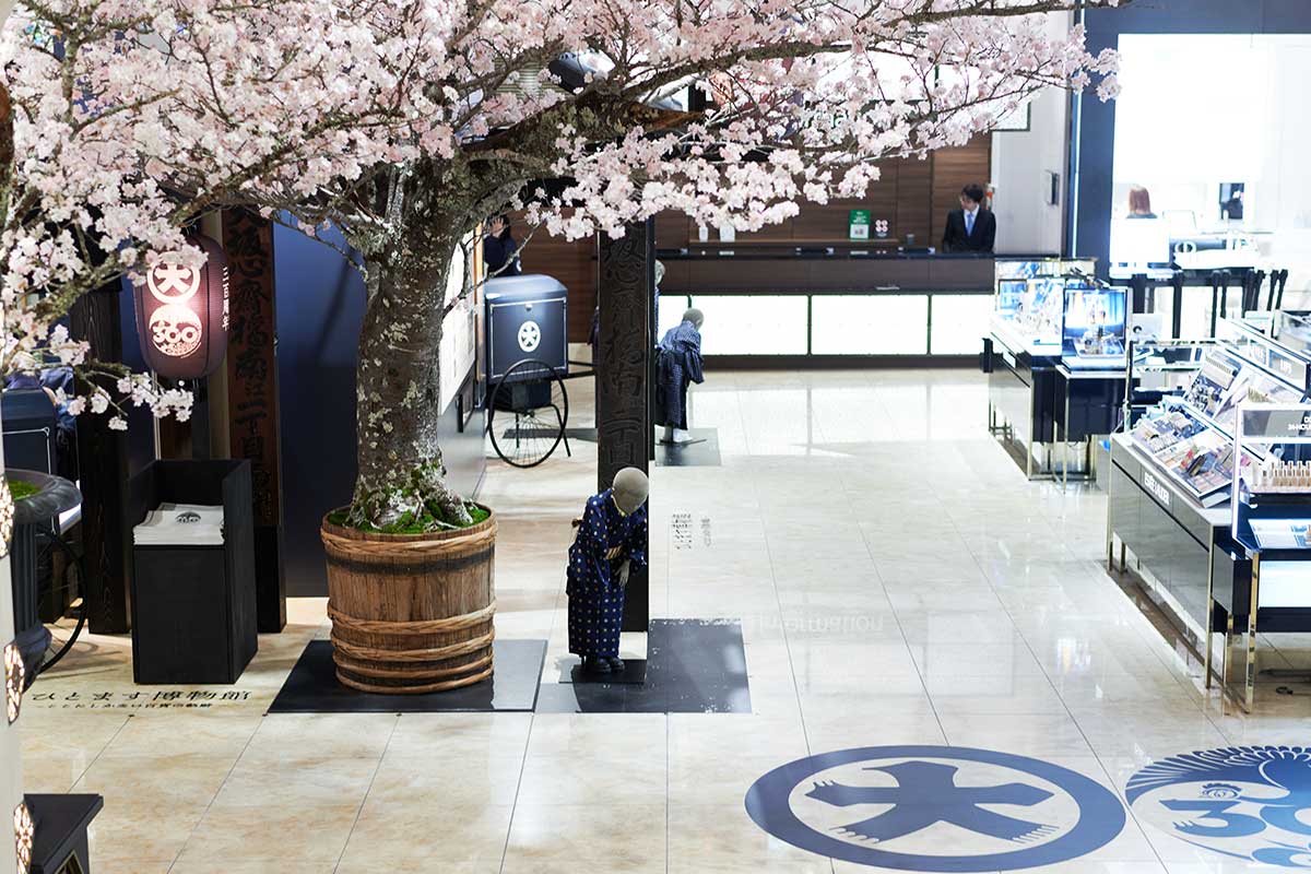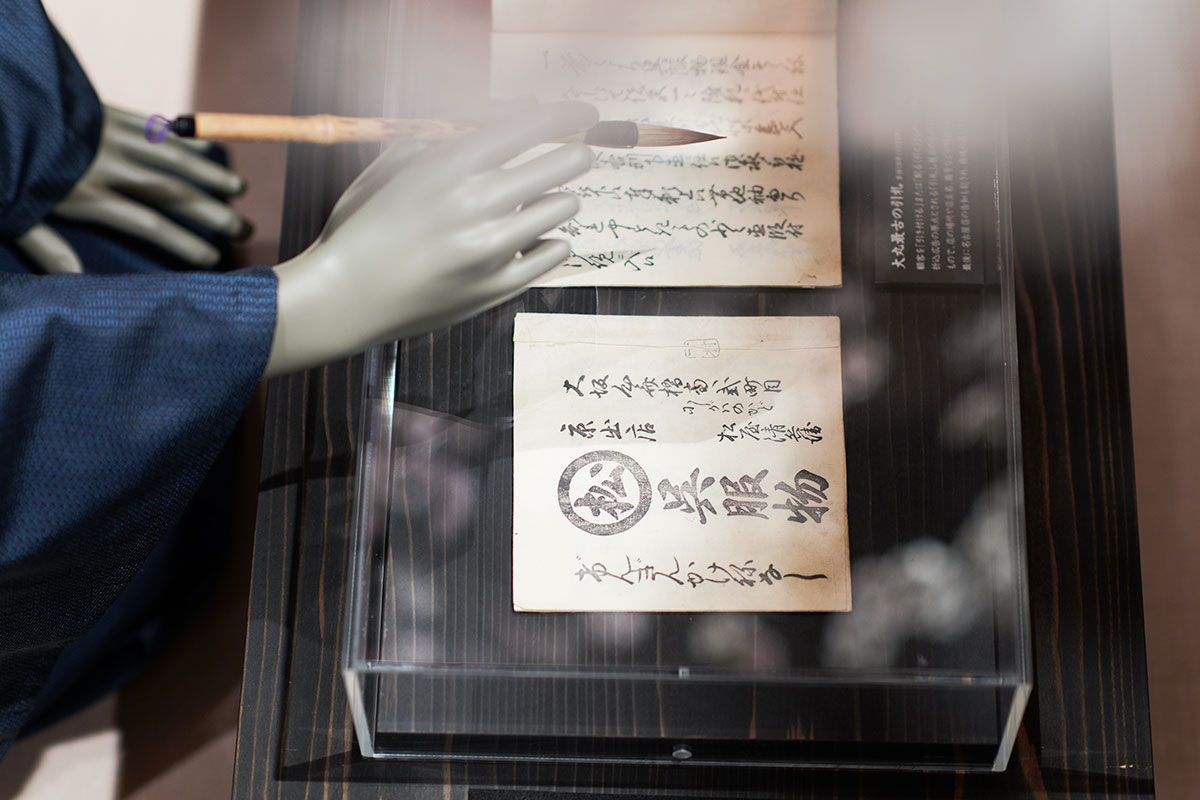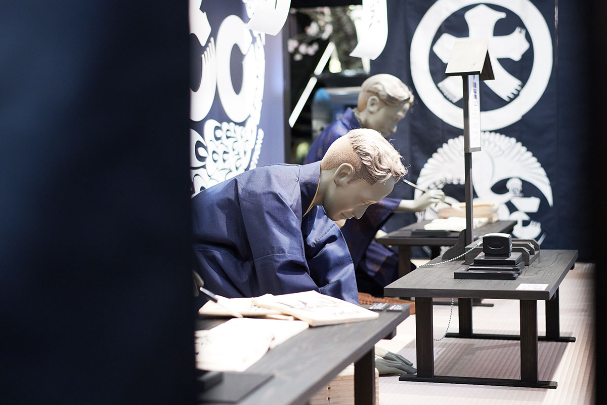 1階の展示は、「座売りの頃の店先」をテーマに、大丸心斎橋店の前身「松屋呉服店」が江戸時代から明治にかけて、顧客が畳の座敷に上がる様式で商いをしていた頃をイメージした展示です。