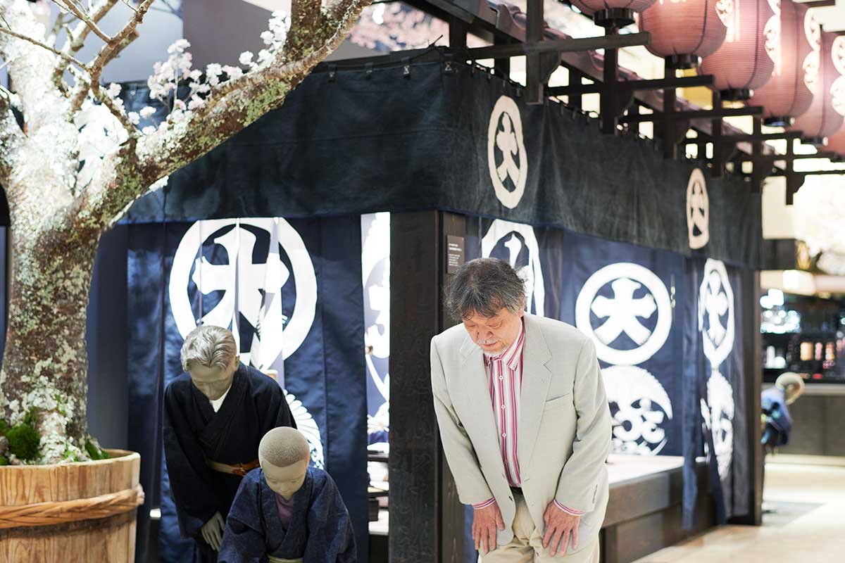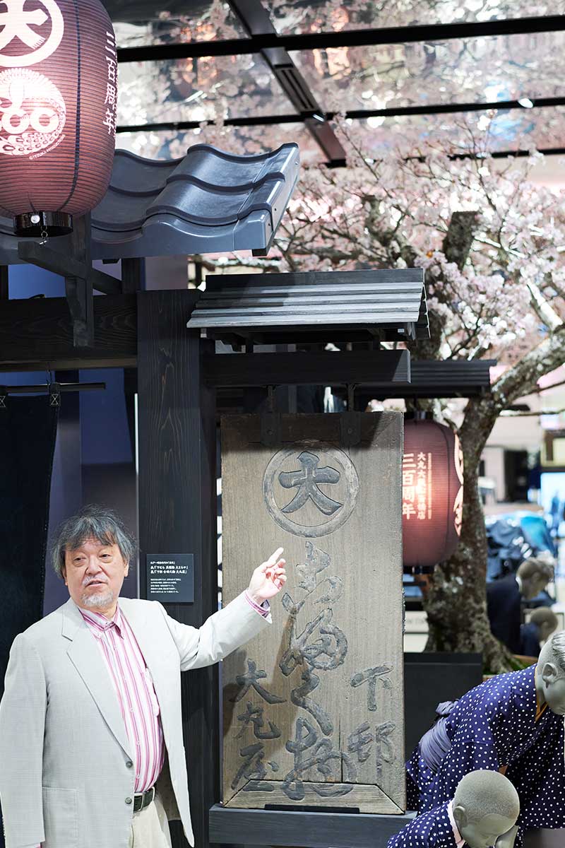 大丸心斎橋店本館御堂筋側入口近くに設けられた「ひとます博物館」1階の展示を前に、橋爪さんは、まずは300年という途轍もなく長い時間、同じ場所で商売をしてきた大丸心斎橋店の偉業について感嘆します。