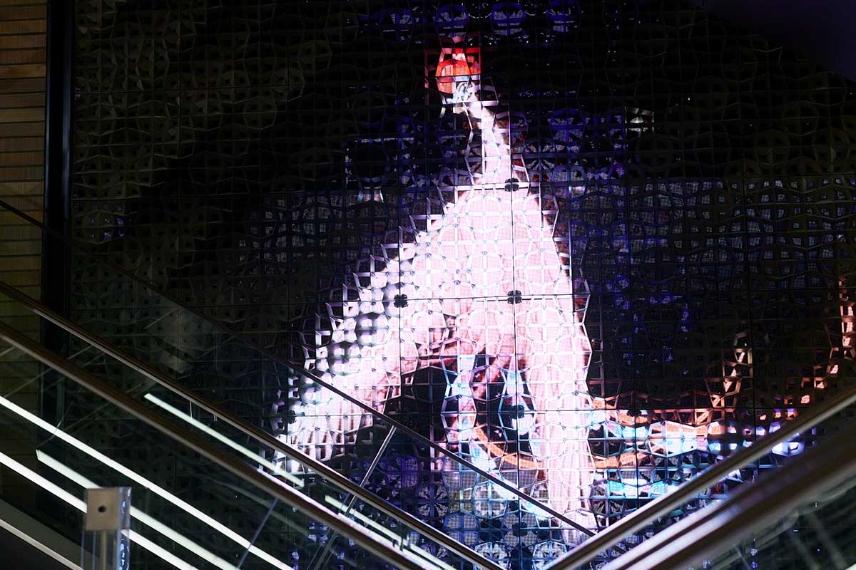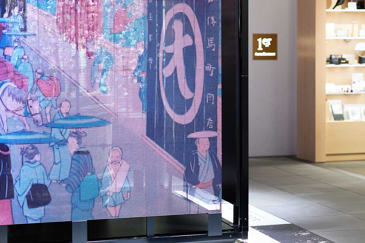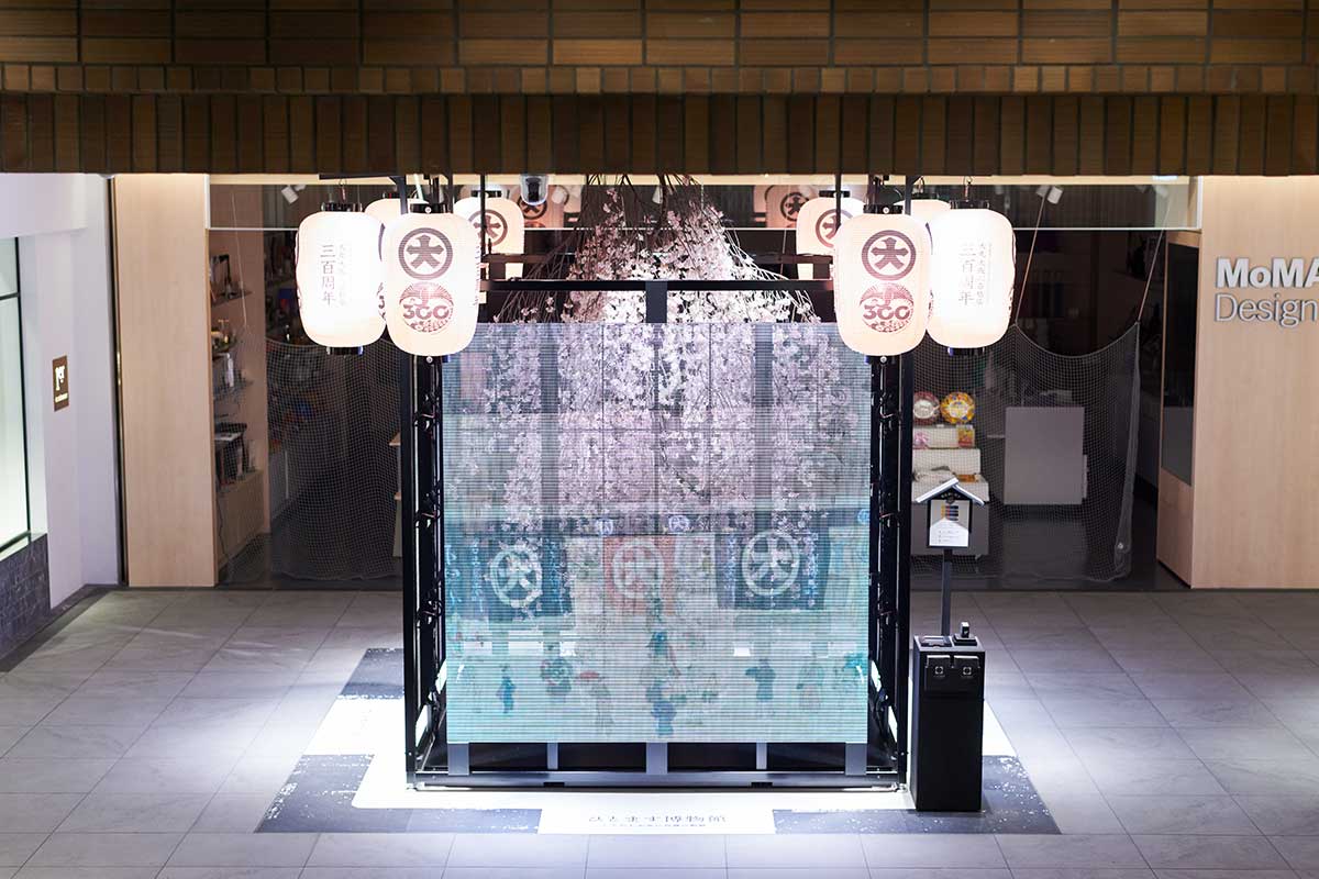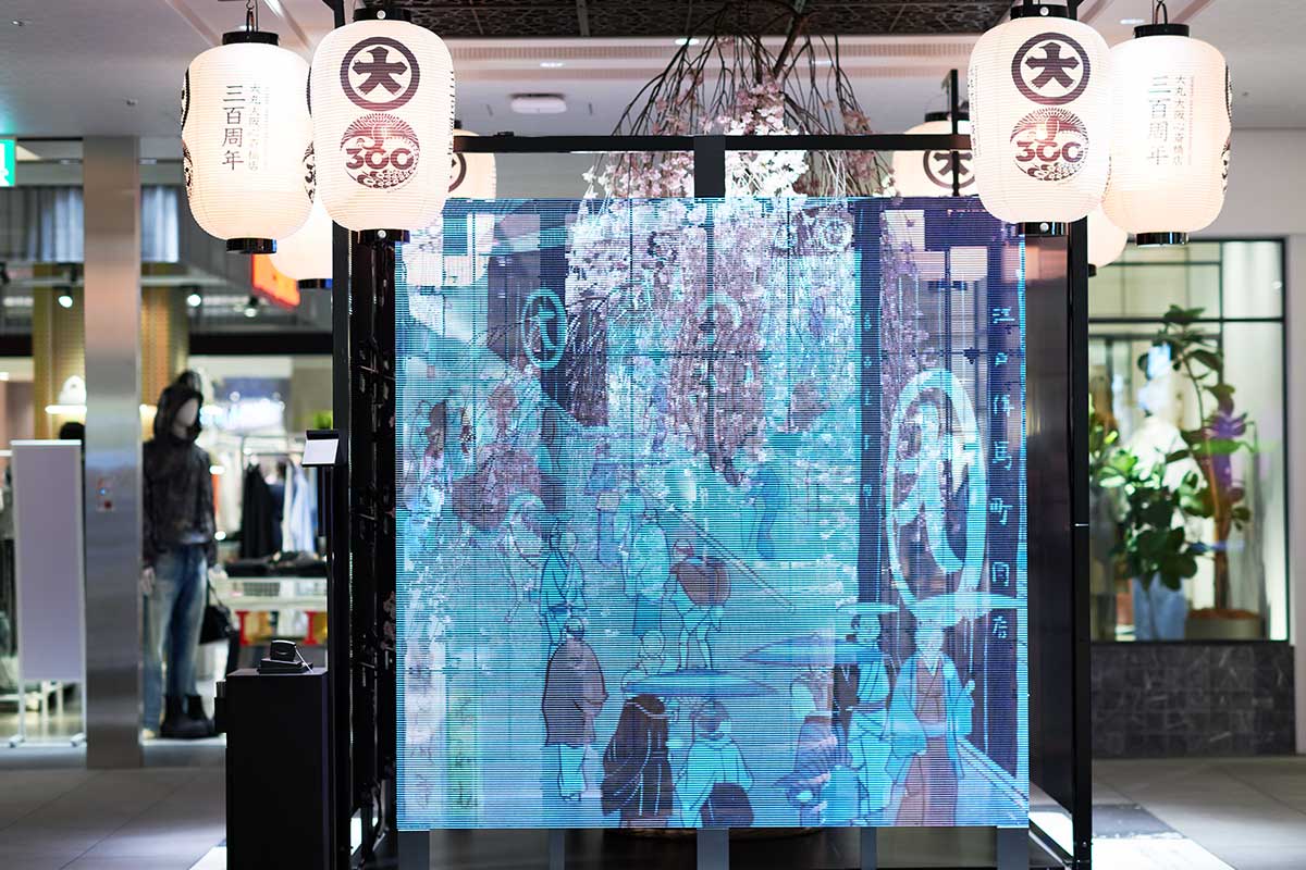 1階の展示を堪能したあとは、エスカレーターで2階へと上がります。傍にある幅4m×高さ50mの大型インスタレーション「D-WALL」では、300周年記念キャラクターとなった『火の鳥』が羽ばたくダイナミックなデジタルアートが展開しています。