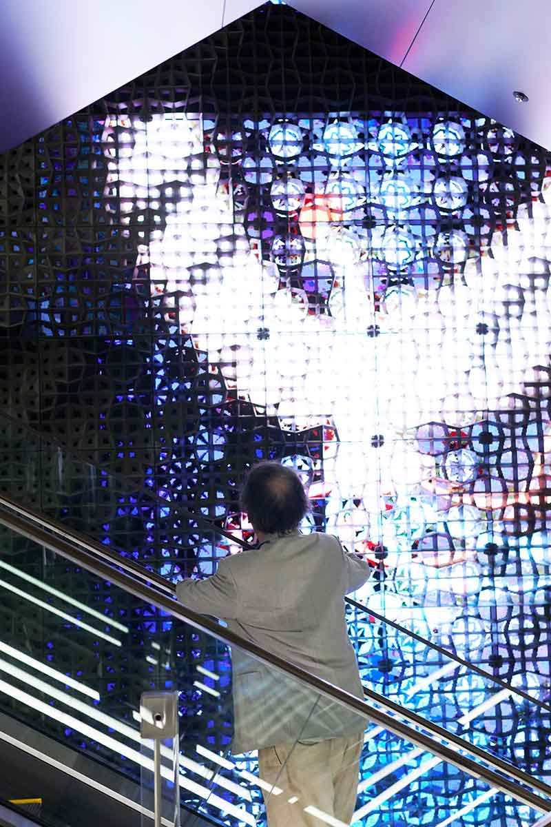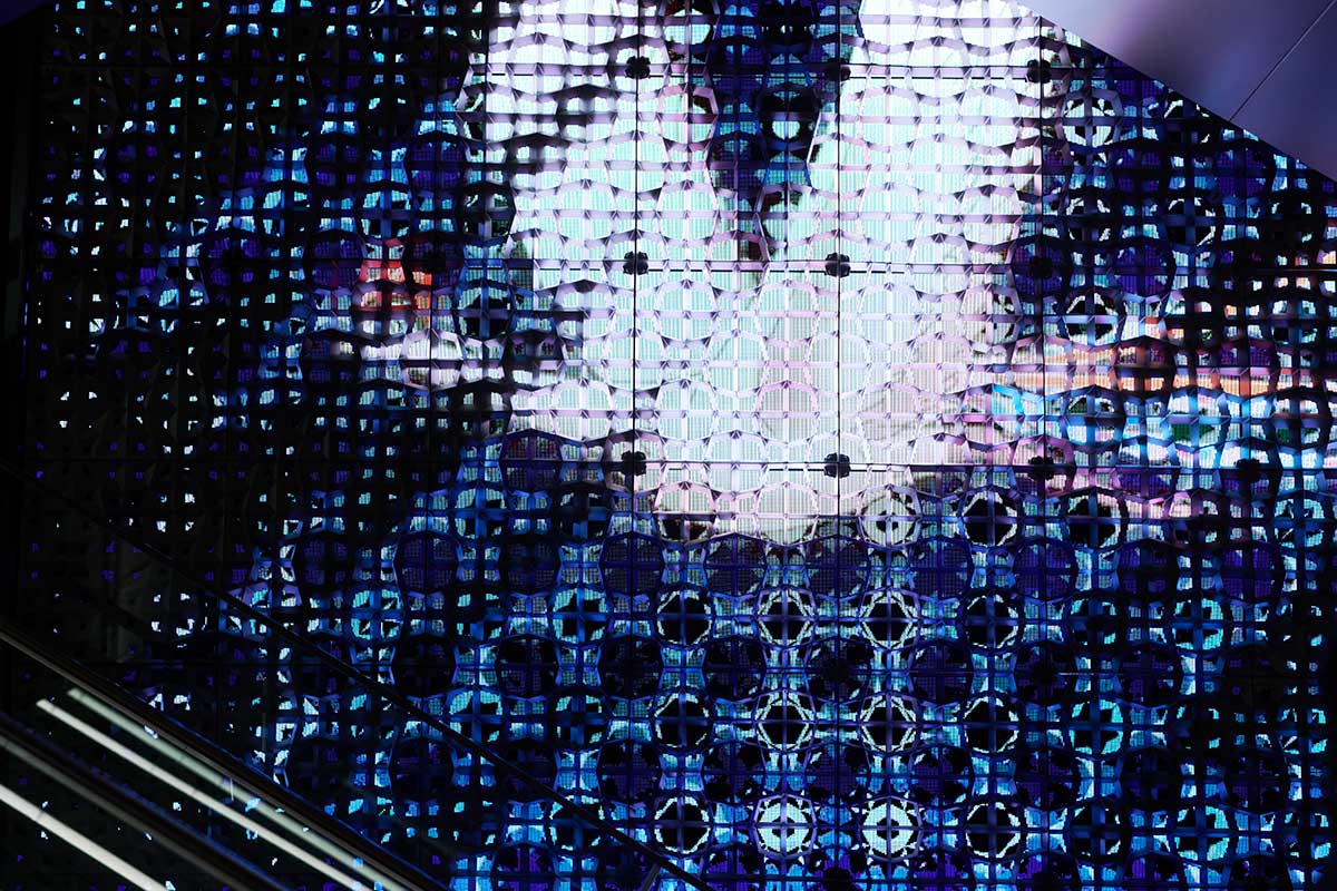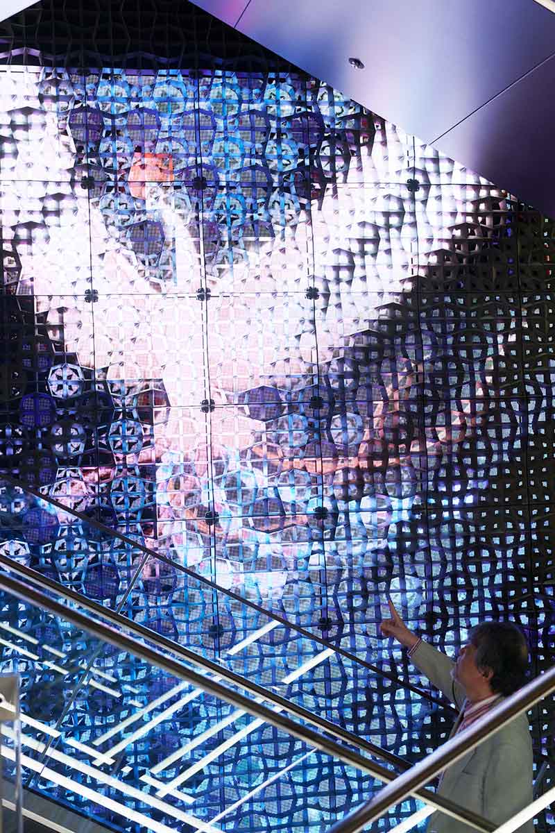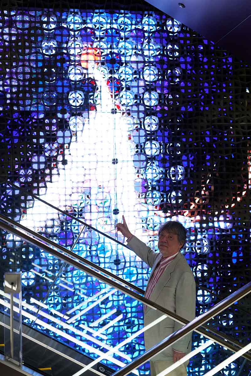 1階の展示を堪能したあとは、エスカレーターで2階へと上がります。傍にある幅4m×高さ50mの大型インスタレーション「D-WALL」では、300周年記念キャラクターとなった『火の鳥』が羽ばたくダイナミックなデジタルアートが展開しています。