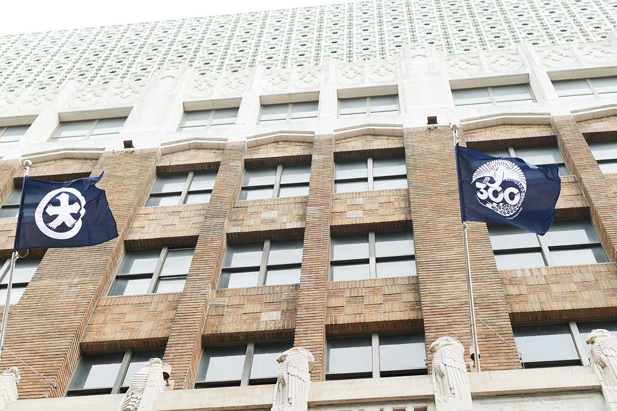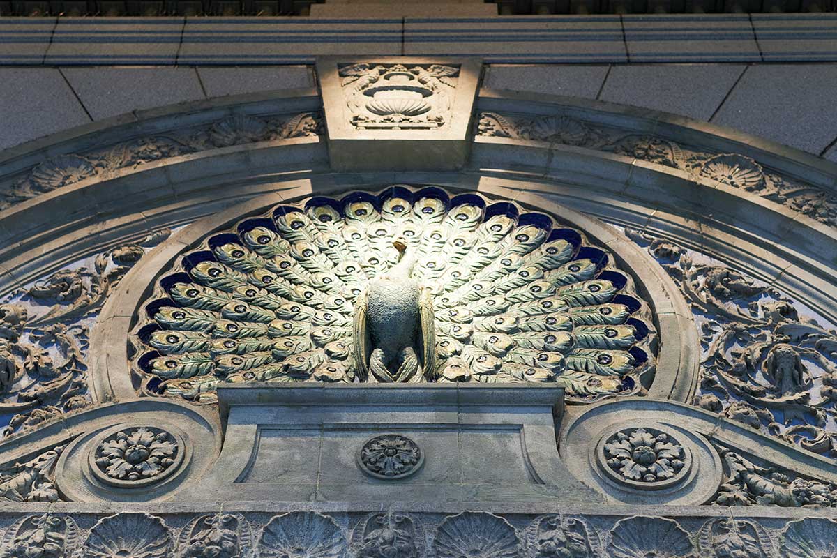 「今回の300周年で『火の鳥』がキャラクターとして活躍してますが、大丸心斎橋店は、1918(大正7)年ウィリアム・メレル・ヴォーリズ建築事務所の設計で竣工したにもかかわらず、わずか2年後の1920(大正9)年に火災に遭いました。そして再びウィリアム・メレル・ヴォーリズに設計を発注するのですが、心斎橋口入口に飾るレリーフを、灰の中から蘇るといわれる不死鳥の図案をアメリカの会社に発注しましたが、なぜか送られてきたのは孔雀だった。本来はフェニックス—火の鳥になるはずだったのが、以降、ピーコックは大丸心斎橋店のシンボルになったわけです。それがこうやって約100年を経て甦るのはとても面白い」