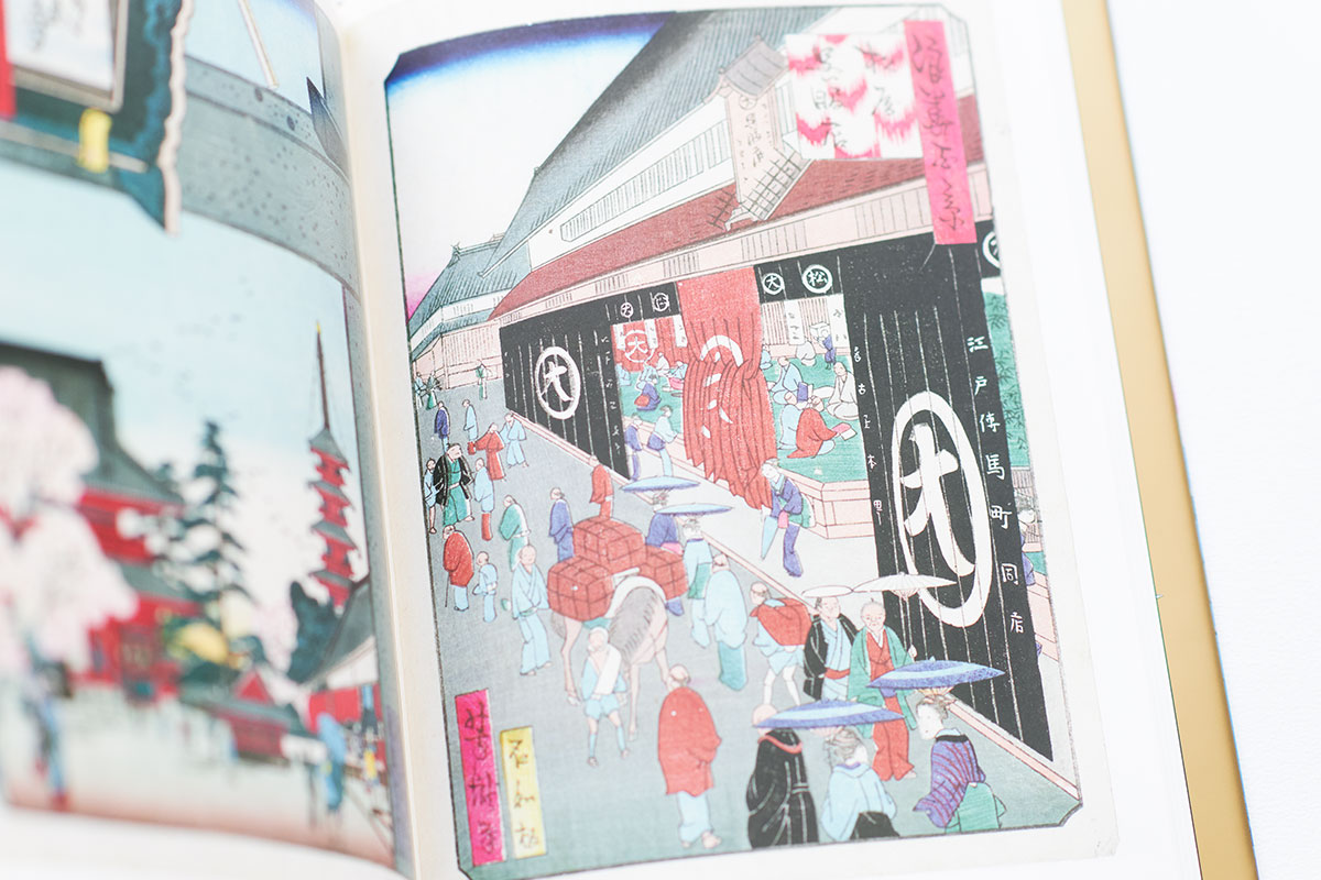 2階には、浪花(大坂)の百の景色を描いた浮世絵シリーズ『浪花百景』に描かれた大丸心斎橋店(当時は松屋呉服店)の展示がありました。実は橋爪さん。2020年に刊行された『原寸復刻「浪花百景」集成』(創元社)の編著者です。