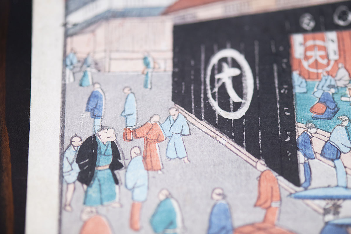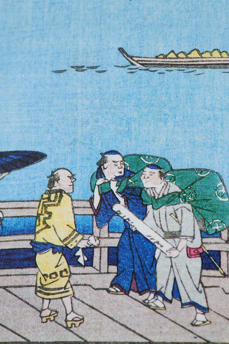 「『浪花百景』は、歌川国員、南粋亭芳雪、里の家芳瀧の3人の歌川派の浮世絵師の合作ですが、これを描いたのは芳瀧。大丸の大きな暖簾に、“江戸傳馬町”と“名古屋本町”が記されているのは面白い。左側には大坂相撲の関取も歩いていますね。勝手に物語を想像すると、タニマチに着物をつくってもらいに関取が大丸に来て、『ごっつあんです』と言っている(笑)。女性が傘を差しているのは暑い季節で日傘なのかな。『浪花百景』には、この絵に加えてもうひとつ大丸が出てくる絵があるんだけど、それは後ほどお話ししましょう」と橋爪さん。
