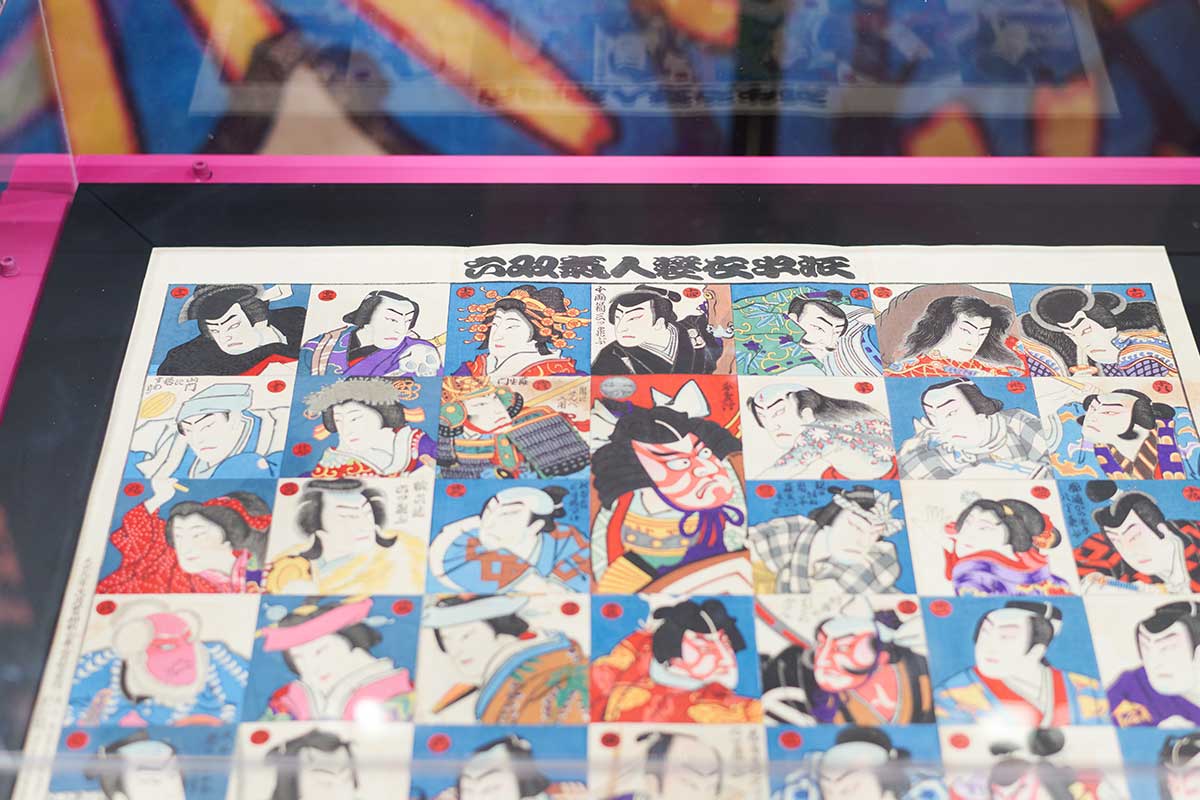 「左端に大正元年と記されてますね。こういう双六は、お正月用にと年末年始に配るもので、いろんな種類があります。ここに展示されているような芝居関連のものが多くて、忠臣蔵などいろいろあります。昔はこういうとても豪華な配りものが多くて、僕はこの本に載っているメリーゴーランドも持っていますよ」