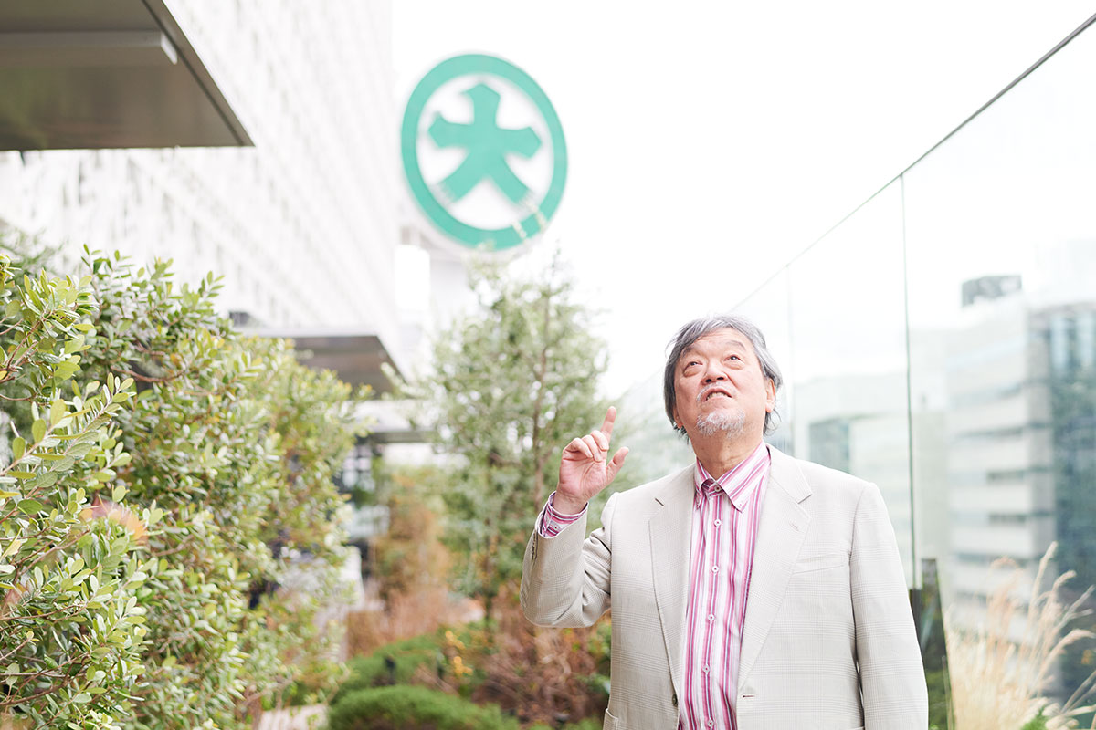橋爪さんにとってなじみ深い「大」マークを近くから見ることができるということで大丸心斎橋店7階のテラスに出ると、「大」マークとともに水晶塔も間近にふれられることに橋爪さんは驚かれたようです。