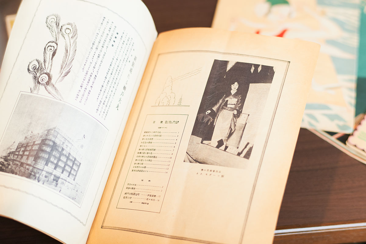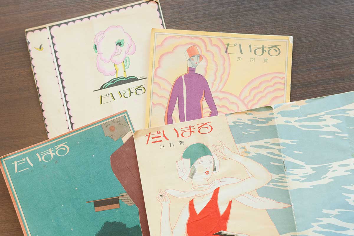 そのときの展示や資料を集大成したのが、橋爪さんの著書『モダン心斎橋コレクション』。オールカラー・273ページに、とても貴重なグラフィックがたっぷり詰まった名著です。その中で26ページを割いて大丸心斎橋店が紹介されています。そこに「美しき人生、美しき生活、美しき宣伝—PR誌『だいまる』のエレガンス」というページがあり、大丸心斎橋店が昭和初期に発行していた広報誌が掲載されています。橋爪さんはこの『だいまる』の実物を数冊所蔵されていて、この日持ってきてくれました。