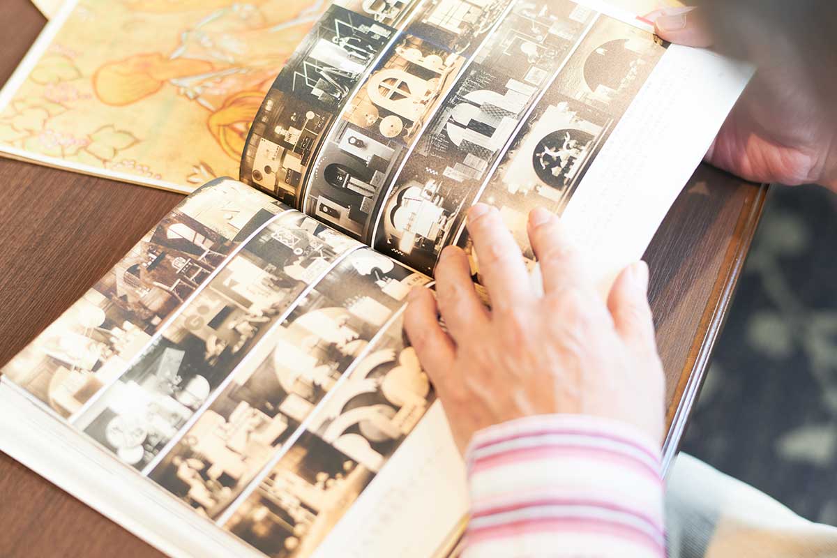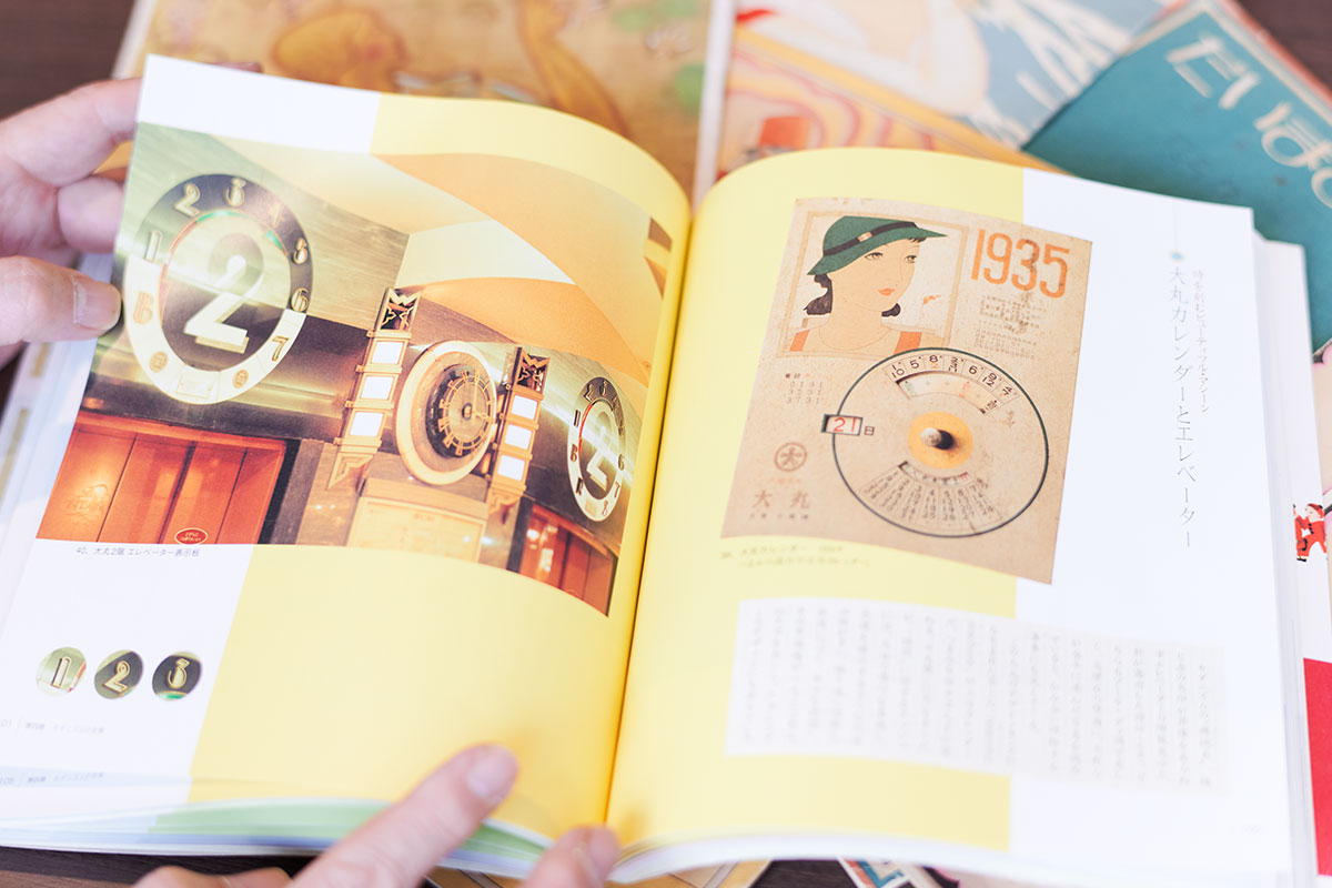 300周年を迎える大丸心斎橋店の記念グッズのアイデアがひらめいた様子の橋爪さん。さらに『モダン心斎橋コレクション』のページをめくりながら、「このエレベーター表示版はちょうど文字盤としていけるから(笑)、これをモチーフに時計をつくれますね。缶バッジもいい?」とアイデアがあふれ出します。