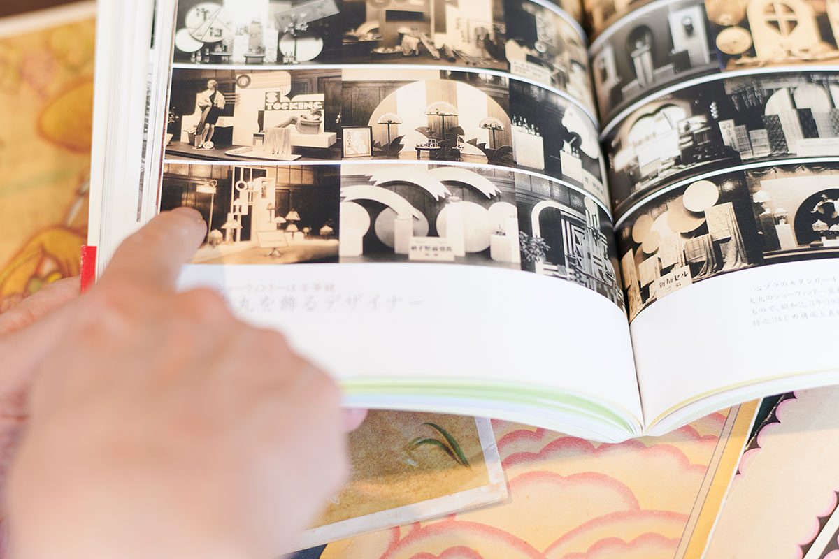 「金山新六さんは大丸宣伝部所属のデザイナーで、心斎橋筋側のショーウィンドウのディレクションを手がけて写真で記録していた。ここに掲載されているのは昭和2、3年の頃のものが中心で、構成主義的なデザインは、心ブラするモガやモボの目を奪ってたはず。今も心斎橋筋側のショーウィンドウに力を入れてるでしょ? こちらは歩いている人にショーウインドーをじっくり見てもらい、御堂筋側のファサードは、車に乗っている人を瞬間的に魅きつけるという戦略でしょうね」