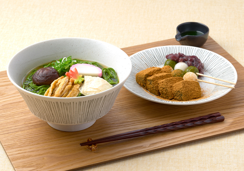紅葉が色づくかごとく、彩り鮮やかな抹茶そばに甘く炊いた椎茸やお揚げさん、湯葉などをトッピング。心も身体も温まる美味しさ。