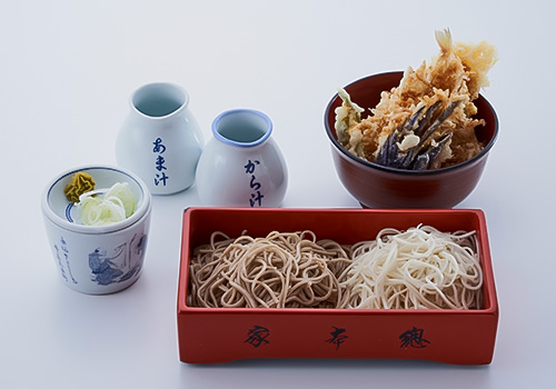 プリッとした食感のイカ、サクッと揚がったキスの天ぷらを、のどごしのよい御前そばと、香り高い太兵衛そばと一緒にお楽しみ下さい。