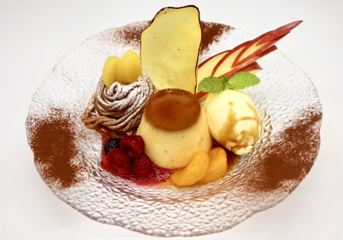 どこか懐かしいプリンア・ラ・モードを秋らしくアレンジしました。濃厚なモンブランと自慢のプリンに、爽やかなレモンアイスを添え、さらにさつまいもチップスの食感をプラス。一皿で秋の味覚を存分にお楽しみいただけます。