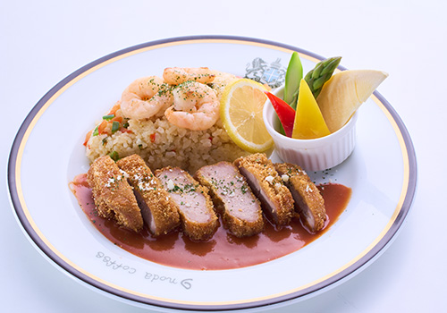 キメ細やかでしっとりと柔らかいポークカツをバターの芳醇な香りが食欲をそそるエビピラフと共に贅沢に盛り付けました。付け合わせには旬の野菜を使用した彩り豊かなマリエを添えて。昨年人気を博したあの味が春の訪れとともに帰ってきました。この季節だけの特別な一皿を是非ご堪能下さい。