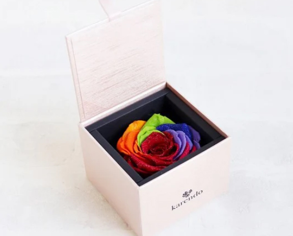 1ボックス(幅8.5cm 奥行き8.5cm 高さ6.5cm)希少な天然ダイヤモンド入りラメを花びらにまとったプリザーブドローズ。