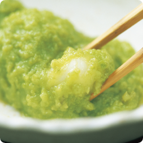 風味豊かな枝豆を独自の配合でブレンドした「ずんだ」をコクのあるさっぱりとした餡に仕上げています。山芋入りの生地で包み、ふっくらと蒸し上げました。