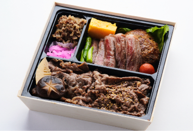 ステーキ、ハンバーグ、すき焼き、牛丼、焼肉を入れた、牛肉をふんだんに使用したお弁当です。