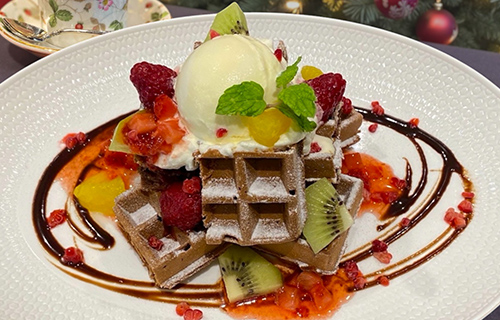 ゆったりと落ち着いた雰囲気の、大人がくつろげるカフェ。香り高いコーヒーとともに、外はパリッ、中はふんわりモチッのワッフルも味わえます。